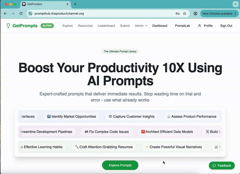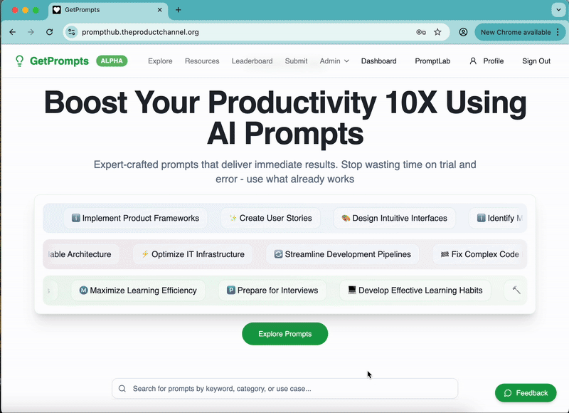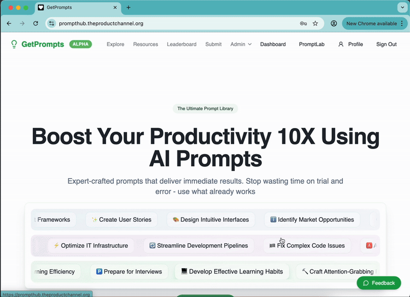 Welcome to GetPrompts! Let's walk through how this AI companion can supercharge your product development workflow. I'll show you exactly how each feature works with real examples you can try today.